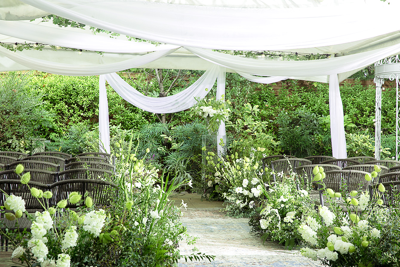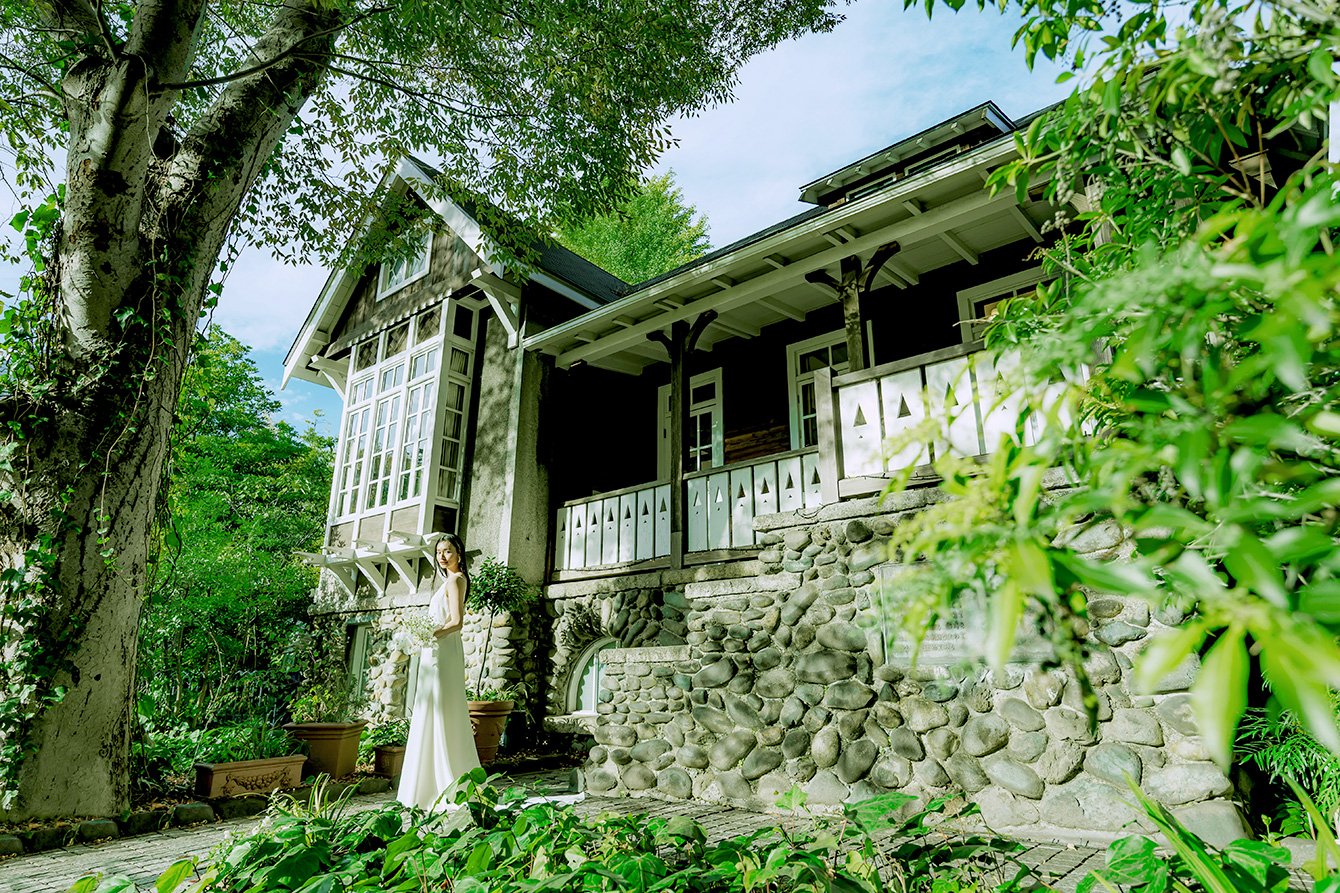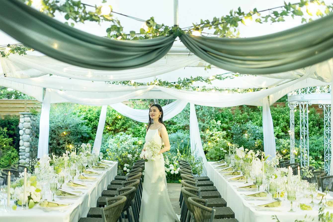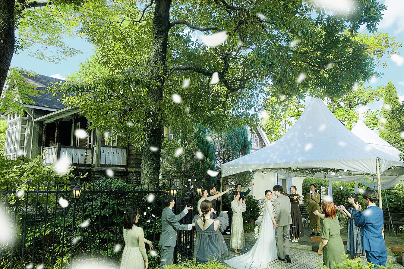 豊かな緑と季節の花々に彩られた洋館、またはヨーロッパのガーデンパーティーを思わせるテントスタイルも人気です。