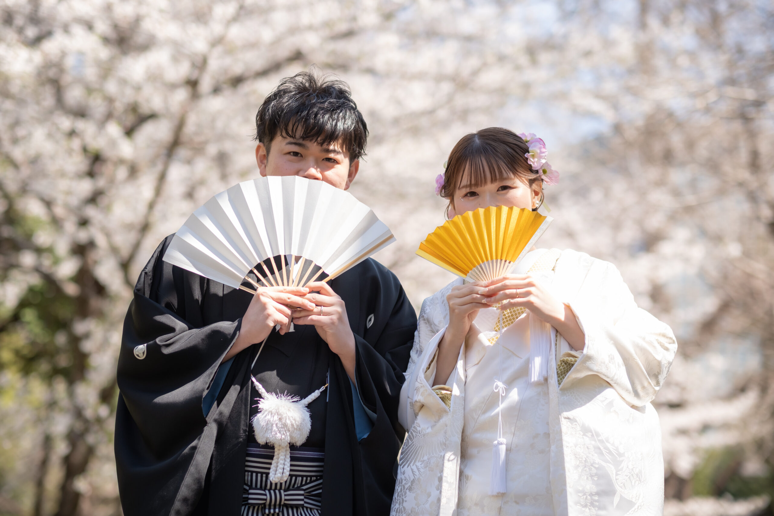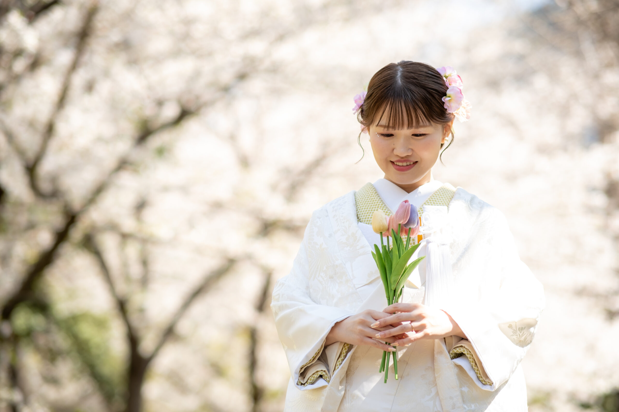 満開の桜を背景にしたお写真はもちろん、自然な笑顔やふとした瞬間も素敵な思い出の一枚に。 新婦さまの着物姿も春の景色に美しく映え、季節感あふれるお写真を残していただけます。
