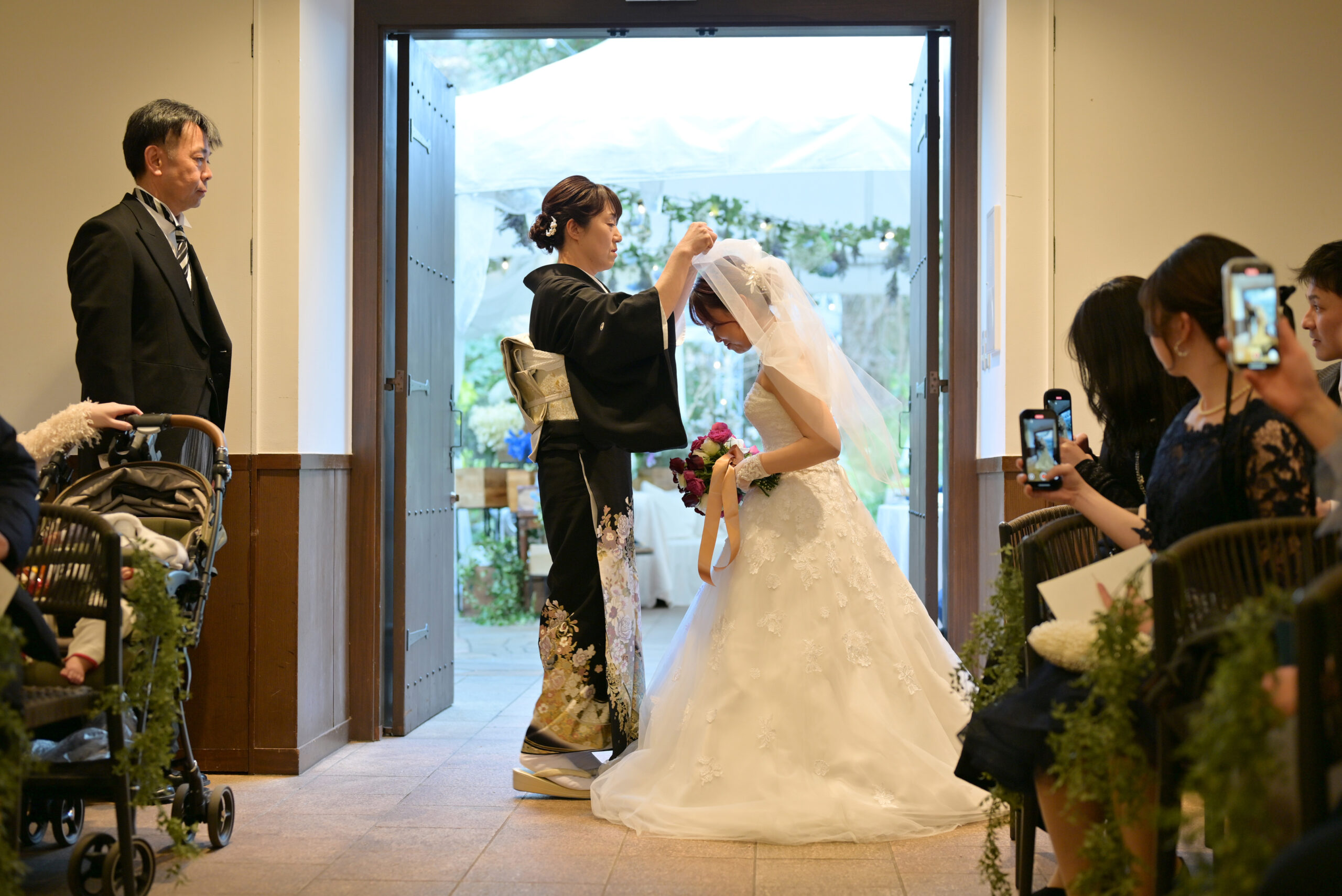 お母様にベールダウン、お父様とご一緒にバージンロードを歩いていただきます