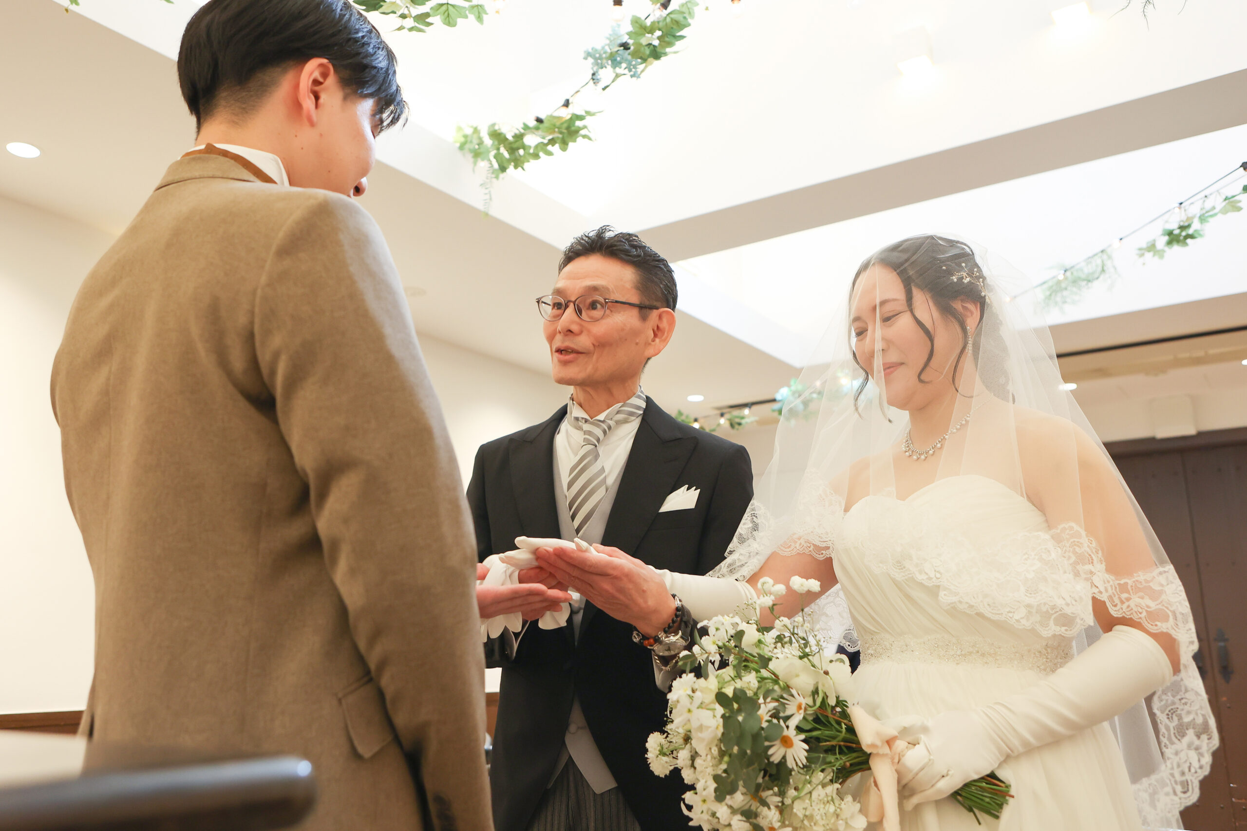 お父様よりご新婦様のお手をご新郎様のお手の上に重ねていただきます